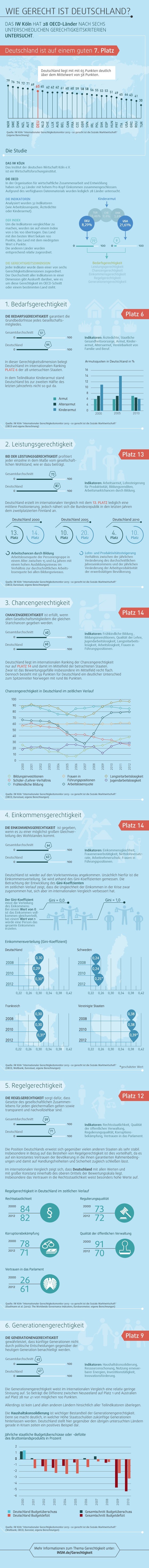 Das Institut der deutschen Wirtschaft hat eine Untersuchung vorgelegt, in der verschiedene „statistische Gerechtigkeitswerte“ vorgestellt werden. In dieser differenzierten Betrachtung wurden 32 Indikatoren untersucht wie Arbeitslosenquote, Ärztedichte oder Kinderarmut und folgenden sechs Gerechtigkeitsdimensionen zugeordnet: Bedarfsgerechtigkeit, Leistungsgerechtigkeit, Chancengerechtigkeit, Einkommensgerechtigkeit, Regelgerechtigkeit sowie Generationengerechtigkeit